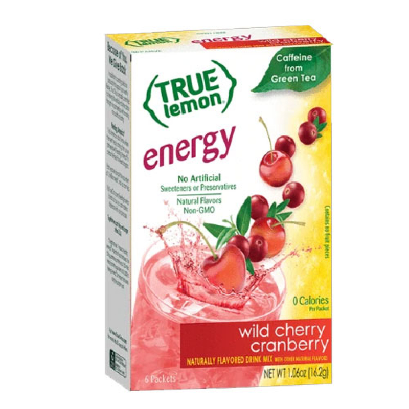 0 calorie True Lemon Wild Cherry Cranberry Drink Mix is made with simple and clean ingredients and powered with natural energy from green tea caffeine to help you through your busy day. With real lemon juice and oils, this Drink Mix is naturally sweetened with Stevia for a refreshing, perfectly balanced beverage so you can drink more water deliciously.