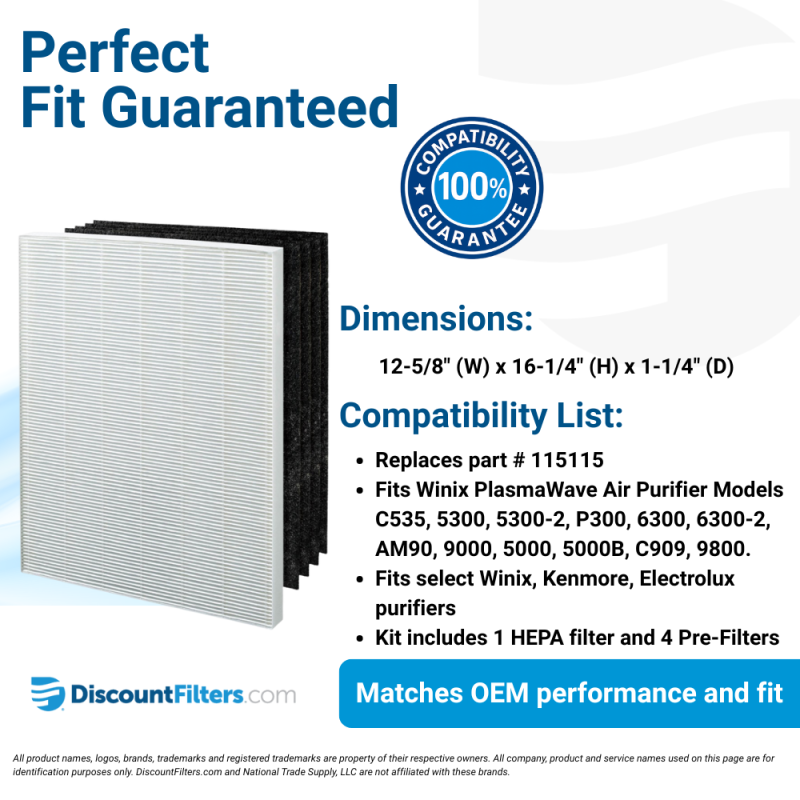 Winix® is a trademark of Winix, Inc.. Kenmore® is a registered trademark of KCD IP, LLC. Winix and Kenmore are not affiliated or otherwise associated with DiscountFilters.com. Any all all use of these marks on this site is for identification purposes only and such use is not intended to, does not, and shall not be deemed to imply any association or affiliation between National Trade Supply, LLC or DiscountFilters.com and Winix, Inc. or Kenmore.