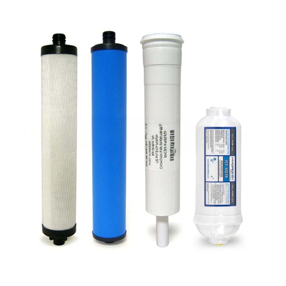 - Set includes 1st Stage Split Carbon / Sediment pre-filter, 2nd stage RO membrane, 3rd Stage Granular Activated Carbon post-filter, and 4th stage chlorine taste and odor "bullet" filter with 3/8" Quick Connect ends.