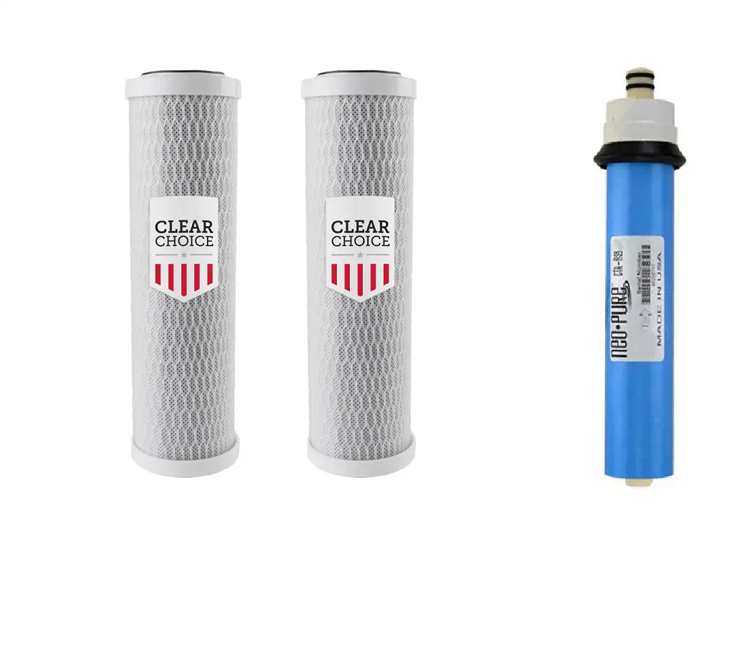 Kit includes 2 ClearChoice CCS044 10 Micron Carbon Filters and 1 Neo-Pure RS9-TFM-50 Reverse Osmosis Membrane