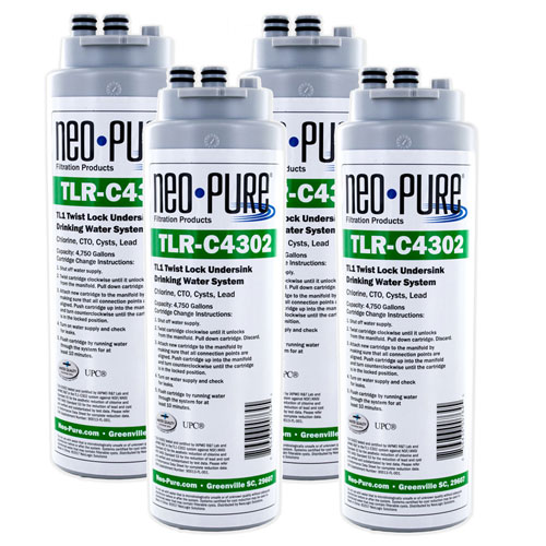 The Neo-Pure TLR-C4302 is the replacement filter cartridge for the Neo-Pure TL1-C302 water filtration system. This activated carbon filter removes several contaminants, such as lead and cysts, making drinking water safer and better tasting. Installation is made easy with the twist lock system, and the cartridge features a capacity of 4,750 gallons making it a very long lasting filter.
