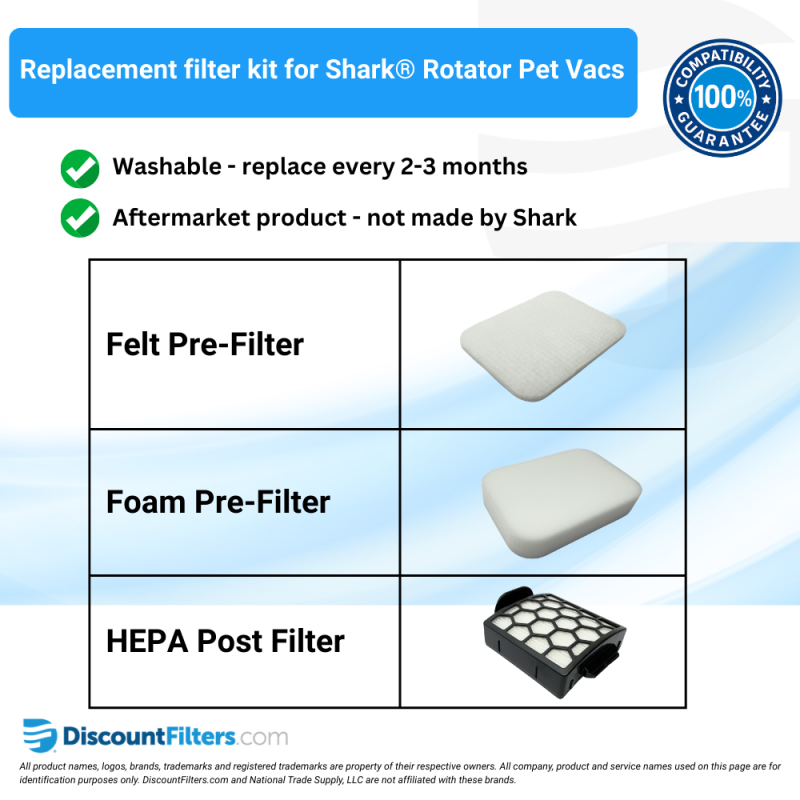 Shark® is a trademark of SharkNinja Operating LLC. which is not affiliated or otherwise associated with DiscountFilters.com. Any all all use of this mark on this site is for identification purposes only and such use is not intended to, does not, and shall not be deemed to imply any association or affiliation between National Trade Supply, LLC or DiscountFilters.com and Shark® or SharkNinja Operating LLC. Any use of the Shark® brand names or model designations for this product are made solely for purposes of demonstrating compatibility