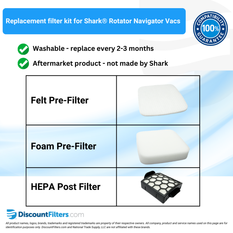 Shark® is a trademark of SharkNinja Operating LLC. which is not affiliated or otherwise associated with DiscountFilters.com. Any all all use of this mark on this site is for identification purposes only and such use is not intended to, does not, and shall not be deemed to imply any association or affiliation between National Trade Supply, LLC or DiscountFilters.com and Shark® or SharkNinja Operating LLC. Any use of the Shark® brand names or model designations for this product are made solely for purposes of demonstrating compatibility